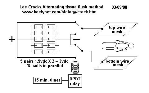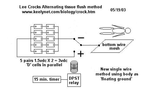 It uses just ONE wire screen with the body being a kind of 'floating ground'. Positive to the screen for 15 minutes, negative to the screen for 15 minutes. Some even switch the wires (alligator clips) by hand using a kitchen timer set for 15 minutes and report positive results. Would be great to buildup a database of conditions the machine seemed to help (ideally verified with orthodox medical tests such as X-ray, sonogram, serology, MRI, biopsy, etc..) along with protocols (times, periods, locations on body, etc.) used in each case.