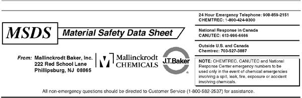 Mallinckrodt Baker, Inc. provides the information contained herein in good faith but makes no representation as to its comprehensiveness or accuracy. This document is intended only as a guide to the appropriate precautionary handling of the material by a properly trained person using this product. Individuals receiving the information must exercise their independent judgment in determining its appropriateness for a particular purpose. MALLINCKRODT BAKER, INC. MAKES NO REPRESENTATIONS OR WARRANTIES, EITHER EXPRESS OR IMPLIED, INCLUDING WITHOUT LIMITATION ANY WARRANTIES OF MERCHANTABILITY, FITNESS FOR A PARTICULAR PURPOSE WITH RESPECT TO THE INFORMATION SET FORTH HEREIN OR THE PRODUCT TO WHICH THE INFORMATION REFERS. ACCORDINGLY, MALLINCKRODT BAKER, INC. WILL NOT BE RESPONSIBLE FOR DAMAGES RESULTING FROM USE OF OR RELIANCE UPON THIS INFORMATION.