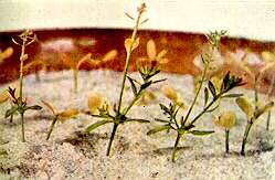 Field plants showing chlorosis and die-back of tip growths on acid soil.
