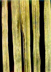 Leaves intervenal chlorotic strips and intervenal white streaky lesions (cf.