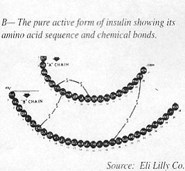 Insulin is a peptide hormone meaning that it is a protein compound made up of more than one chain of amino acids. Amino acids are the building blocks of body proteins and it is the number, type and sequence of specific amino acids that determine the individual structure and function of thousands of different proteins in all living organisms. Table 1 lists the 20 amino acids from which all protein is made and Figure 1 shows the amino acid sequence of the insulin molecule in two different stages of formation: A) in its storage form called proinsulin and B) its active form that travels to target cells.