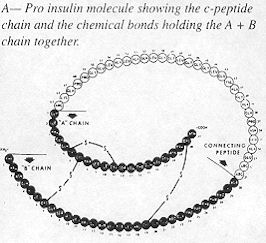 After the ribosomes have constructed a "rough model" of the insulin protein, it is moved to the interior channels of the endoplasmic reticulim where enzymes further modify the molecule separating it into two peptide chains (the A chain and the B chain) that are connected by a third peptide chain called the connecting peptide, also known as C-peptide. (see Fig. 1A)