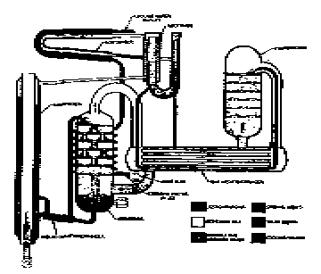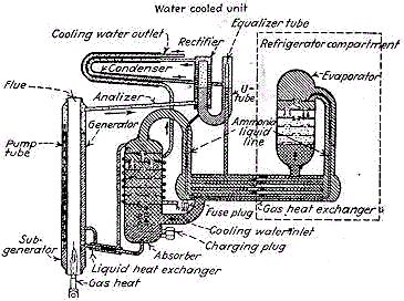 The 1935 model Electrolux air cooled unit has a charge pressure of 380 lb./sq. in.; 8 cubic feet of hydrogen; 1 pint liquid ammonia and 2 pints of water.