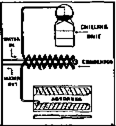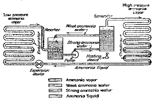 The absorption system makes use of the high affinity that water has for ammonia vapor. One cubic foot of water can absorb as much as 800 cubic feet of ammonia gas at 39 degrees F.