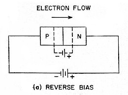 In this arrangement, the free electrons in the ntype material are attracted toward the positive terminal of the battery and away from the junction. At the same time, holes from the ptype material are attracted toward, the negative terminal of the battery and away from the junction. As a result, the spacecharge region at the junction becomes effectively wider, and the potential gradient increases until it approaches the potential of the external battery. Current flow is then extremely small because no voltage difference ( electric field ) exists across either the ptype or the ntype region. Under these conditions, the pn junction is said to be reversebiased.
