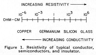 Semiconductor materials lie in the range between these two extremes, as shown in Fig. 1. Pure germanium has a resistivity of 60 ohmcentimeters. Pure silicon has a considerably higher resistivity, in the order of 60,000 obm-centimeters. As used in semiconductor devices, however, these materials contain carefully controlled amounts of certain impurities which reduce their resistivity to about 2 ohmcentimeters at room temperature ( this resistivity decreases rapidly as the temperature rises ).