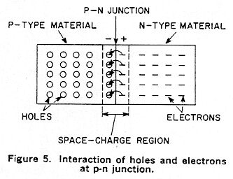 When ntype and ptype materials are joined together, as shown in Fig. 5, an unusual but very important phenomenon occurs at the interface where the two materials meet ( called "the p-n junction" ). An interaction takes place between the two types of material at the junction as a result of the holes in one material and the excess electrons in the other.