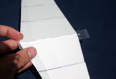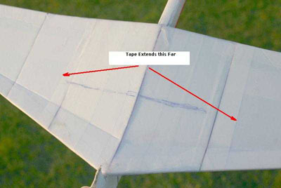 When the joint is solid, tape up the wing. I used tape around the leading and trailing edges, also in the center of the wing at the location of the center of gravity running the entire length of the wing. Then I used tape across the chord of the wing in the center on both sides out to just past the first wing section in the center. The tape is essential, without it the wing will bend on launch.