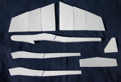 Next, parts can be drawn on the foam. With an extra copy of the plans, you may cut paper templates from the plans or you could just draw the pieces on the foam by measuring off the plans. A good scissors will cut the foam plate material easily or it could be cut with a knife or razor blade.