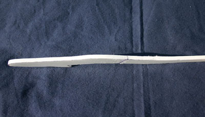 At the same time I decided it was time to refine the design of the plane and try some new ideas. First I thought if I were to bend an airfoil into the wing, this would make it stiffer and also produce a better glide. I also thought I would try to make the whole plane lighter by cutting down on material, the wing would use only tape for additional strength. To start with I did not have enough tape on the wing and it buckled again near the center of one wing half. I then used transparent tape around across the wing chord all the way passed the second splice both top and bottom, this appears to be strong enough.