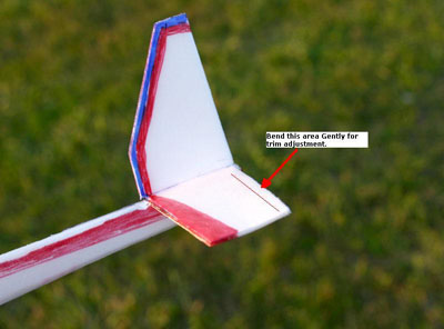 Trim adjustments have to be very small on a glider that goes so fast right after launch. You can put small bends into the trailing edge of the wing or the rear of the stab. My glider has been trimmed to turn slightly to the left, I bank it to the right on launch. The glider turns gradually to the right on the way up and then turns to the left gradually on the way down, just before the glider was ready to stall. Launch at no more than 45 degree angle, otherwise it will either loop or come straight down after it reaches the top of the launch.
