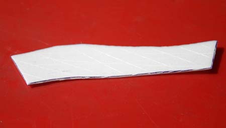 | Cut out a right and a left side of the milk carton cardboard so it appears crème color on both side of the fuselage. | Cut foam away under cardboard so bottom of catapult hook area can be glued together. |