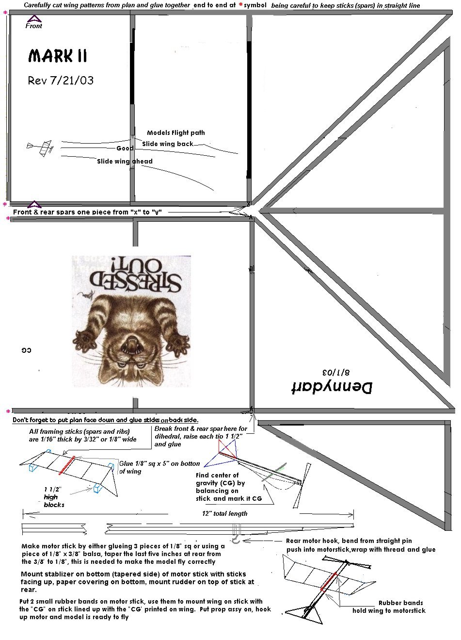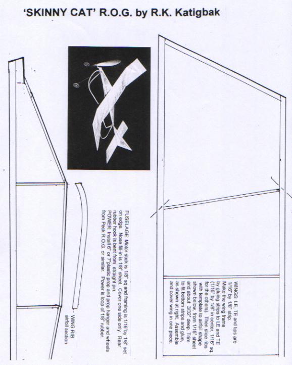Jun from Manila sent me several designs for the contest, but the one I chose to build was the Skinny Cat. The Skinny Cat has the look of the popular "Pussycat" designs, in a configuration much like a no-cal plane. Instructions for the Skinny Cat are on the plan.