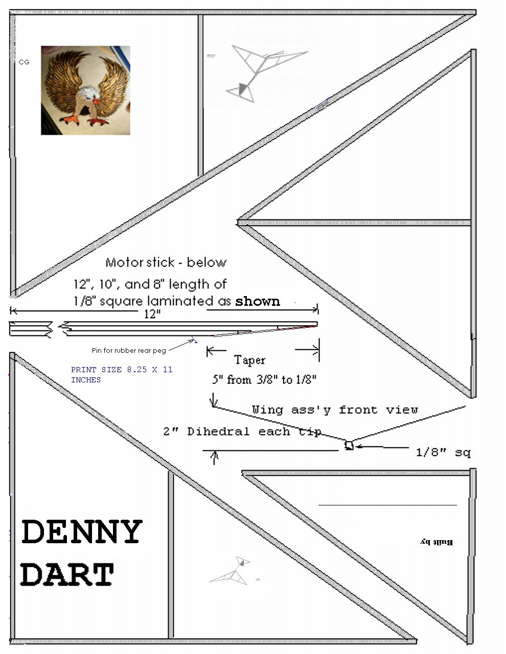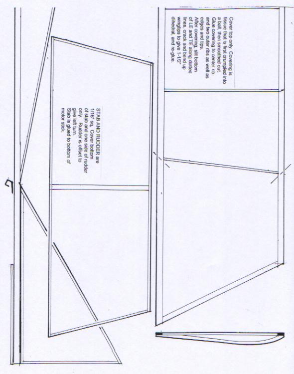 The original Denny Dart had a very simple swept-back wing with V-dihedral. I thought it was a sharp looking plane and it flew well for me both indoors and outside. Best indoor flight for me under 22' ceiling was 53 seconds. In my opinion the big improvement over the Delta Dart was that the wing was adjustable. Another feature was that the left wing was longer than the right panel, for extra lift when flying circles to the left.