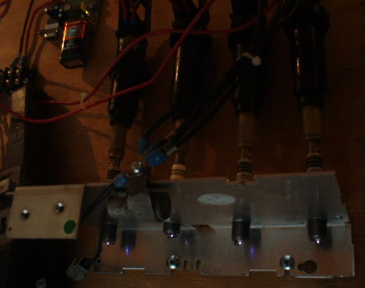 Next I connected some 'dumb' (no internal igniter) BMW coils in place of the Ford coilpack. I used coils that are on most 6/8/12cyl late model BMWs from late 2002 on up, such as a 2003 745i. BMW part number is 12131712219, list price about $31 each. The coils have a triangular connector. The top terminal (4a) is secondary ground, lower left terminal (15) is +12Vin, and the lower right terminal (1) connects to the EDIS coil driver. These charged to the same 6A threshold in about 2.1mS -- or almost half the time of the Ford coilpack. The wheels started turning in my head, what would happen if I connected two COP coils in series, which doubles their inductance and thus the charge time. Eureka! It worked; the charge time was just slightly longer than with the Ford coilpack. And if I installed one pair of coils in cylinders 1 and 4, and the other pair in cylinders 2 and 3, they would fire in a 'waste spark' configuration just like the Ford system, and I'd be driving the 4 coils with only one EDIS module. Others looking at using COP coils were paralleling two EDIS modules to get the capacity to drive 4 coils. (Each EDIS-4 module has two coil driver outputs).