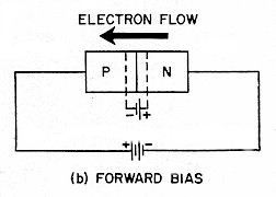 In this arrangement, electrons in the p–type material near the positive terminal of the battery break their electron–pair bonds and enter the battery, creating new holes. At the same time, electrons from the negative terminal of the battery enter the n–type material and diffuse toward the junction. As a result, the space charge region becomes effectively narrower, and the energy barrier decreases to an insignificant value. Excess electrons from the n–type material can then penetrate the space charge region, flow across the junction, and move by way of the holes in the p–type material toward the positive terminal of the battery. This electron flow continues as long as the external voltage is applied. Under these conditions, the junction is said to be forward–biased.