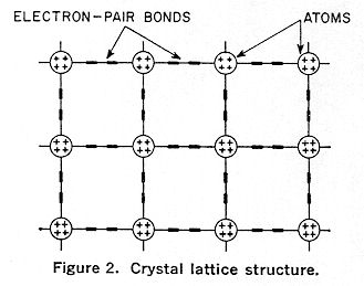 Carefully prepared semiconductor materials have a crystal structure. In this type of structure, which is called a lattice, the outer or valence electrons of individual atoms are tightly bound to the electrons of adjacent atoms in electron–pair bonds, as shown in Fig. 2. Because such a structure has no loosely held electrons, semiconductor materials are poor conductors under normal conditions. In order to separate the electron pair bonds and provide free electrons for electrical conduction, it would be necessary to apply high temperatures or strong electric fields.