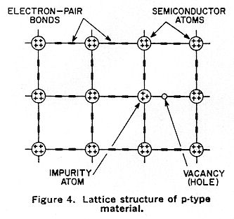 A different effect is produced when an impurity atom having one less valence electron than the semiconductor atom is substituted in the lattice structure. Although all the valence electrons of the impurity atom form electron–pair bonds with electrons of neighboring semiconductor atoms, one of the bonds in the lattice structure cannot be completed because the impurity atom lacks the final valence electron. As a result, a vacancy or "hole" exists in the lattice, as shown in Fig. 4. An electron from an adjacent electron–pair bond may then absorb enough energy to break its bond and move through the lattice to fill the hole. As in the case of excess electrons, the presence of "holes" encourages the flow of electrons in the semiconductor material; consequently, the conductivity is increased and the resistivity is reduced.