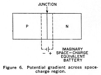 Thermal energy causes charge carriers ( electrons and holes ) to diffuse from one side of the p–n junction to the other side; this flow of charge carriers is called diffusion current. As a result of the diffusion process, however, a potential gradient builds up across the space–charge region. This potential gradient can be represented, as shown in Fig. 6, by an imaginary battery connected across the p–n junction. ( The battery symbol is used merely to illustrate internal effects; the potential it represents is not directly measurable. )
