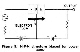 The thick end layers are made of the same type of material ( n–type in this case ), and are separated by a very thin layer of the opposite type of material ( p–type in the device shown ). By means of the external batteries, the left–hand ( p–n ) junction is biased in the forward direction to provide a low–resistance input circuit, and the right–hand ( p–n ) junction is biased in the reverse direction to provide a high–resistance output circuit.   ...